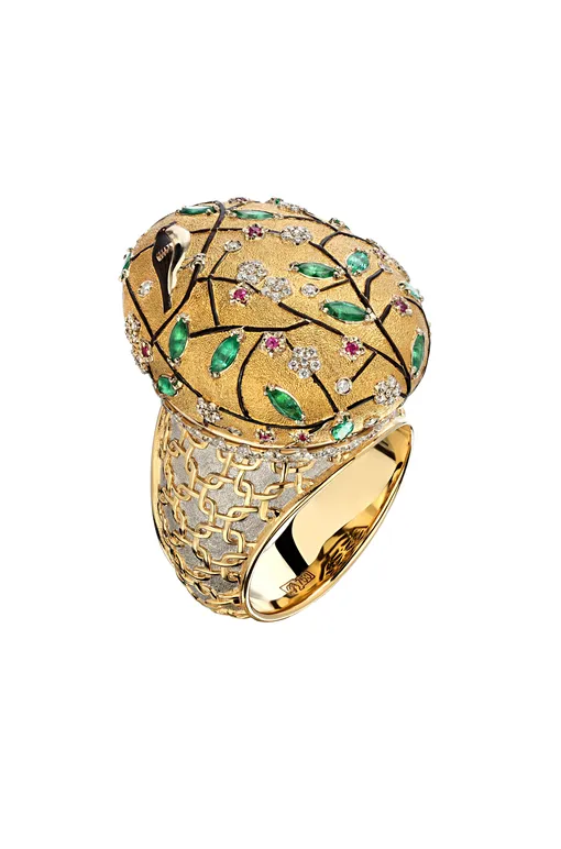 Произведения из резного камня, наследующие шедеврам Фаберже, продемонстрирует бренд Maximilian Silver. Особое внимание советуем обратить на яркие образцы современного высокого ювелирного искусства, в которых мастера применили запатентованные техники и использовали редкие камни. Среди таких премьер — подвеска «Рождение чистоты» от Ilgiz F., кольцо «Япония» от Gevorkyan и кольцо «Сердце Востока» с крупным танзанитом от Ivan Markov Jewelry.