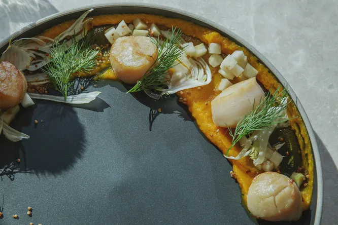 Дегустационный сет состоит из пяти подач, первая из которых — галантин из осьминога с соусом из жёлтых томатов и гриссини с водорослями комбу. За ним следует обжаренный гребешок с соусом из цветной капусты и лимонным гелем, затем запечённый палтус в пряном масле с рагу из огурцов и цитрусовым дайконом. Камбала с трюфельным картофелем и щучьей икрой становится финальным аккордом основных блюд, а завершает меню фундучное кремю с меренгой «Роше», ванильным кремом и кофейным мороженым, напоминая о мягкости и уединении вечера у моря.