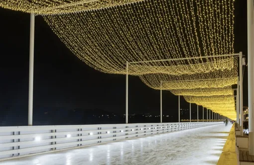 На всем протяжении дорожки над ней сияют гирлянды (более 14 миллионов лампочек!) с эффектом звездного неба и предчувствия праздника. Чтобы сделать впечатления еще ярче, на катке можно выпить горячего какао и поесть зимних сладостей, а для юных неопытных конькобежцев предусмотрены «помощники» — опоры в виде пингвинчиков.