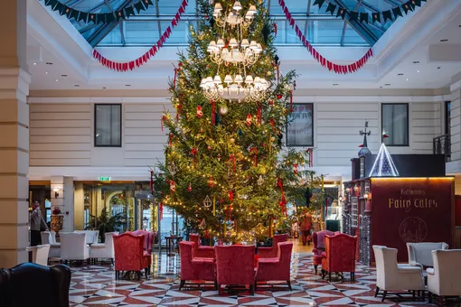 В нынешнем декабре холл-атриум «Мойки 22» руками художника-реставратора Семена Малышева преобразился в нарядную площадь европейской столицы. Тут все как положено: рождественская ярмарка с сувенирами и сладостями, гулянья вокруг огромной елки, украшенной в классическом стиле — с ангелочками, трубящими в трубы, и с золочеными орехами, маленький сказочный театр в Чайной гостиной: там объявлена премьера «Щелкунчика», а фигуры персонажей сказки тоже украшают атриум. Открытие пространства стало настоящим праздником для гостей и друзей гранд-отеля: в этот вечер молодые театральные артисты показали им фантасмагорически-смешное представление по мотивам сказки Чуковского «Айболит».