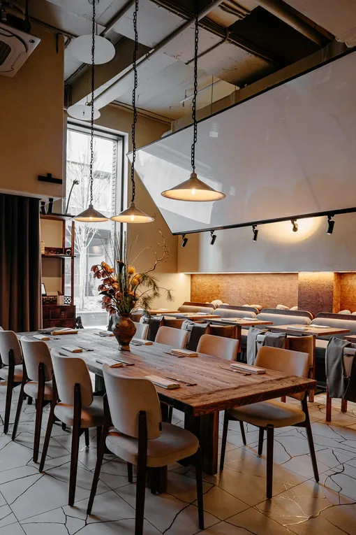 Кухню возглавляет Никита Хлыновский, предлагая современную японскую еду на каждый день с безусловным качеством ингредиентов: лосось из Мурманска, гребешок с Сахалина, хамачи, тунец и ама эби с японских рынков, осьминог из Марокко. Меню сочетает сашими и суши с изысканными хенд-роллами, закуски вроде тартаров и битых огурцов, а также основные блюда — от маринованного бавета и удона до черной трески мисо и осьминога с кремом из цветной капусты. Завершает гастрономическое впечатление барная карта с японским виски, саке, авторскими коктейлями на основе чая и безалкогольными напитками с азиатскими ароматами.