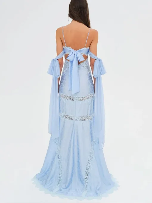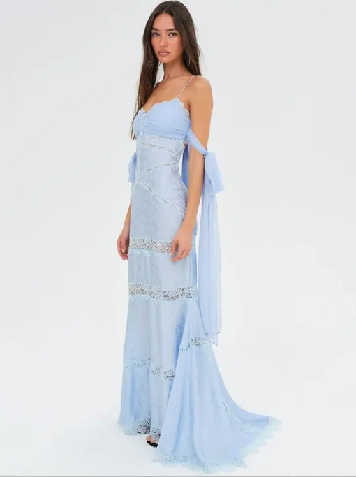 Вечернее платье Rita Lace Gown Blue — это воплощение элегантности и женственности: оно выполнено из шелкового жаккарда с изысканными кружевными вставками и объемным баской из креп-шифонового жабо. Открытое декольте и пышный подол в стиле русалки подчеркивают фигуру, а кружевные детали добавляют романтичности и утонченности. Платье подходит для торжественных мероприятий, где важны и комфорт, и стиль.