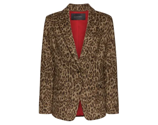 Этот пиджак классического кроя — воплощение элегантности и уверенности: прямой крой, лацканы и накладные карманы придают изделию изысканность, а анималистичный принт с красной подкладкой добавляет образу дерзости и индивидуальности. Бренд Elena Miró ассоциируется с женственным стилем — классическим, но с современными акцентами — и предлагает модели от 42-го до 60-го размера. Такой пиджак станет стильным акцентом в гардеробе, отражая дух свободы и осознанного подхода к моде, которые лежат в основе философии бренда.