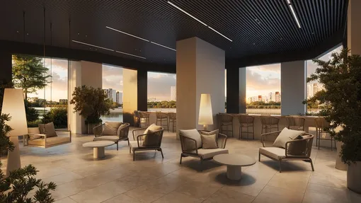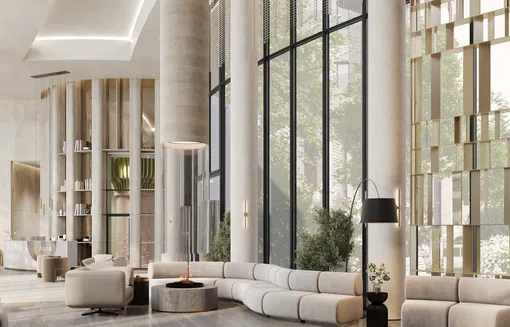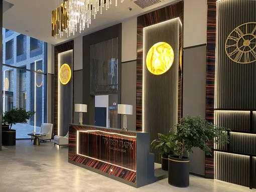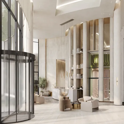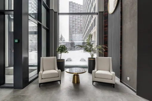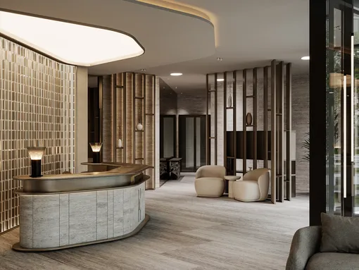 Интерьер выполнен в сдержанной песочно-бежевой палитре, в дизайне использованы оригинальные декоративные решения и натуральные текстуры, подчеркивающие близость к природе. Пространство оживляют деревья и растения в крупных кадках. Гранд-лобби отражает премиальный сервис и подход девелопера к созданию среды, адаптированной под ежедневные сценарии жизни резидентов.