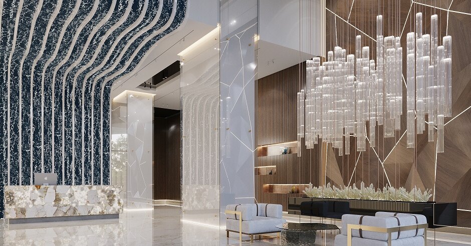 Сочетание двух стихий — основа концепции лобби премиального жилого комплекса Ice Towers от «Град Девелопмент». Концепцию разработали дизайнеры отечественного бюро Geometrium. Выраженная в фасадах тема льда — чистого, невесомого и прозрачного — продолжается в лобби. В дизайне помещений, люстрах и элементах отделки легко считываются образы сверкающего на солнце снега, ледяных ручьев и замерзших кристаллов.