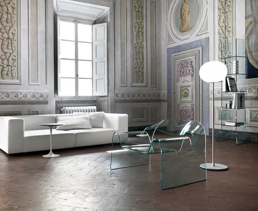 Fiam по праву можно считать переизобретелями стекла. До 1970-х для мебели материал использовали только как плоские вставки. Основатель бренда Витторио Ливи совершил революцию в индустрии, создав специальные печи, позволившие гнуть толстые листы катанного стекла под углом до 90°, сохраняя их прочность. Это открытие позволило дизайнерам Чини Боэри и Тому Катаянаги создать кресло Ghost — объект из единого листа стекла толщиной 12 мм.