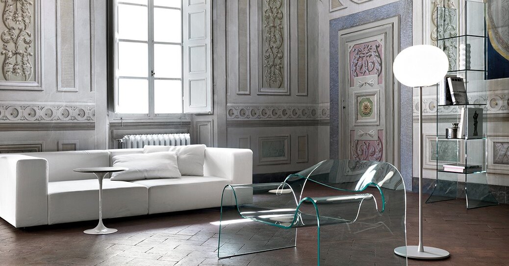 Fiam по праву можно считать переизобретелями стекла. До 1970-х для мебели материал использовали только как плоские вставки. Основатель бренда Витторио Ливи совершил революцию в индустрии, создав специальные печи, позволившие гнуть толстые листы катанного стекла под углом до 90°, сохраняя их прочность. Это открытие позволило дизайнерам Чини Боэри и Тому Катаянаги создать кресло Ghost — объект из единого листа стекла толщиной 12 мм.